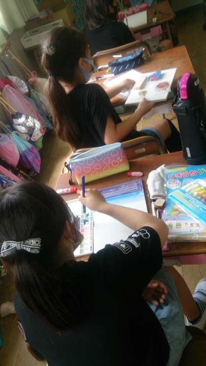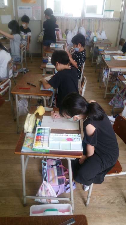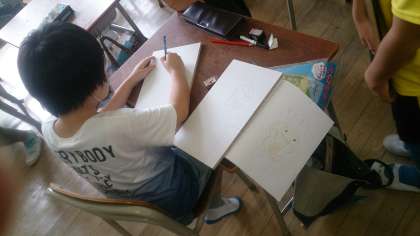 3年生の図画工作で、「くぎうちゲーム」を作っています。最初に、ゲーム盤の板に、子どもたちが思い思いの絵を描いています。