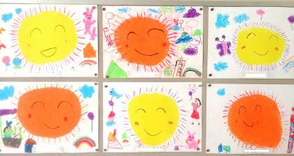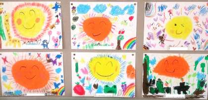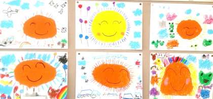 1年生の図画工作で、子どもたちが「おひさまにこにこ」の絵を描きました。見ていると思わずに笑顔になります。