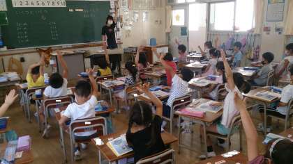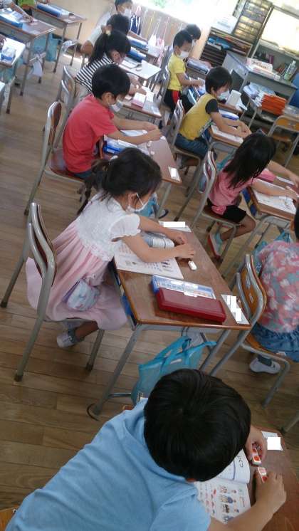 1年生の算数で、6は2と4など、数図ブロックに対応させて個数を数える学習に取り組んでいます。