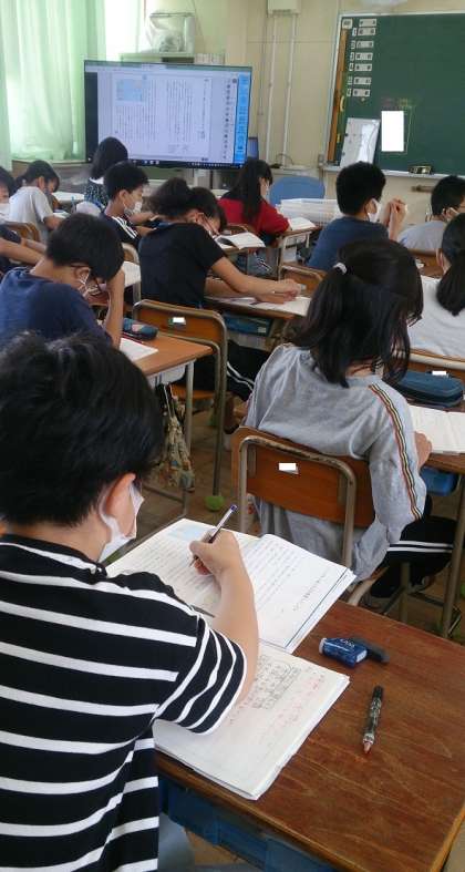 6年生の国語の説明文で、筆者の論の進め方について自分の考えを文章にまとめる学習に取り組んでいます。自分文章を読み返すときのポイントに気を付けてまとめています。