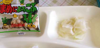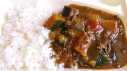 今日の給食は、夏野菜のカレーライス、キャベツのサラダ、豆こんぶです。