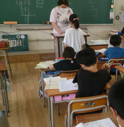 4年生の算数で学年を3分割して、わり算の筆算の学習に取り組んでいます。
