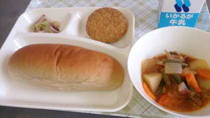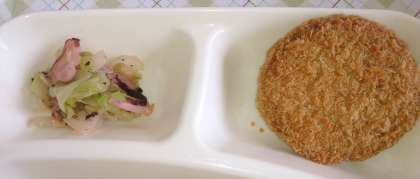 今日の給食は、チキンレバーカツ、ケチャップ煮、たことキャベツのバジルソテー、パン、牛乳です。