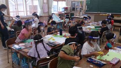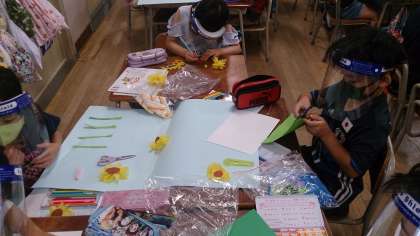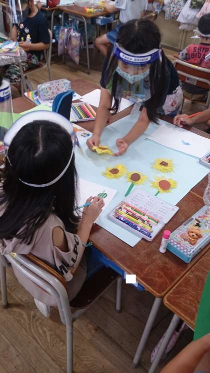 2年生の生活科で「夏」をイメージしたグループの共同作品を創作しています。「ひまわり」や「虫」など、子どもたちが思い思いに考えたものを1つの作品にしていきます。