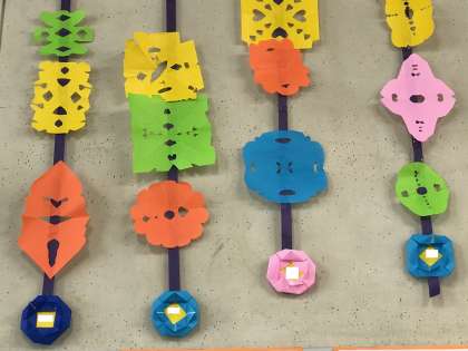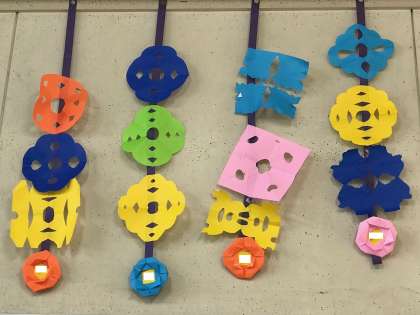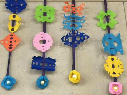 折り紙を四角や三角に折って切ってつくります。