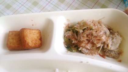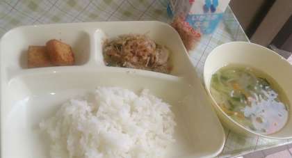 今日の給食は、ゴーヤチャンプルー、すまし汁、あつあげのしょうがじょうゆかけ、ごはん、牛乳です。