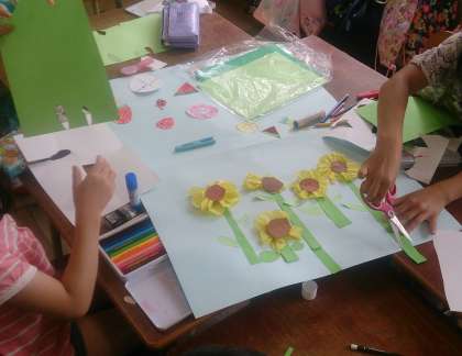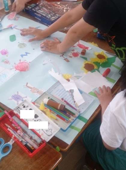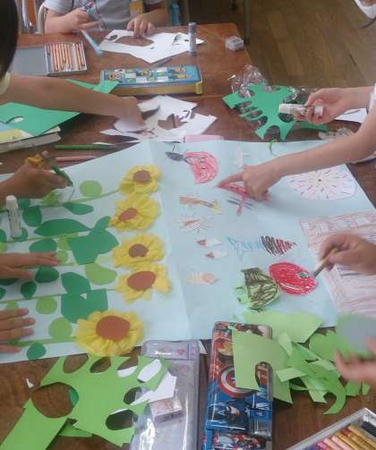 2年生の生活科で「夏」をイメージしたグループの共同作品の完成が近づいてきました。子どもたちが工夫して、「ひまわり」や「虫」「すいか」などをつくり、夏らしい作品になっています。