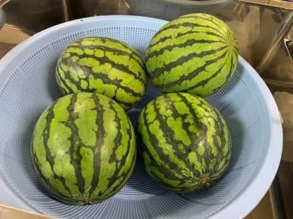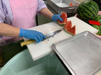 今日の給食に「すいか」が出ます。写真は、給食室での調理の様子です。切る前の「すいか」の色合いがとてもきれいです。