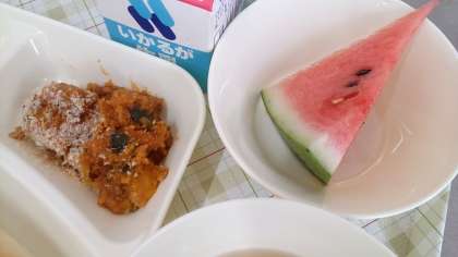 今日の給食は、かぼちゃのミートグラタン、スープ、すいか、パン、牛乳です。