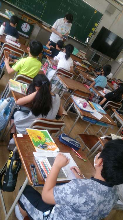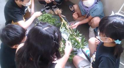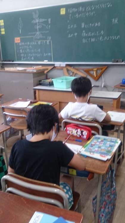 3年生の理科で、植物の体のつくりについて学習しています。虫眼鏡を使って、葉と茎などを観察しています。