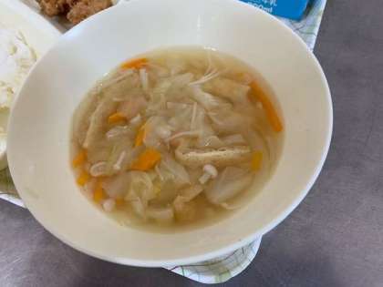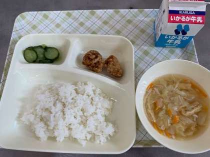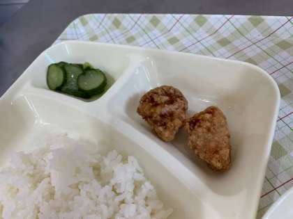 今日の給食は、ごはん、牛乳、豚肉の香味あげ、すまし汁、あっさりきゅうりです。