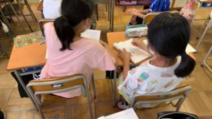 小数のわり算に取り組んでいます。線分図を使って数量関係を調べています。友だち同士で教え合いながらみんな懸命に取り組んでいます。