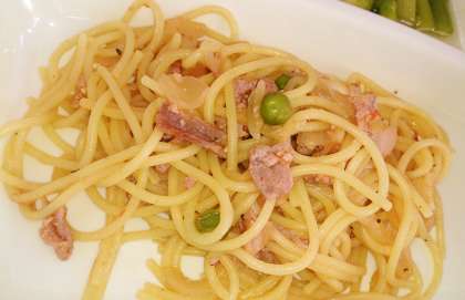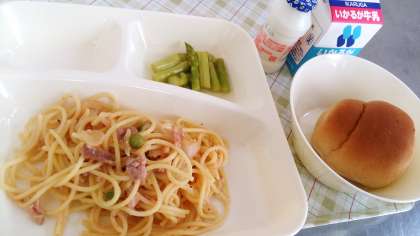 今日の給食は、ポークトマトスパゲッティ、グリーンアスパラガスのサラダ、発酵乳、パン、牛乳です。