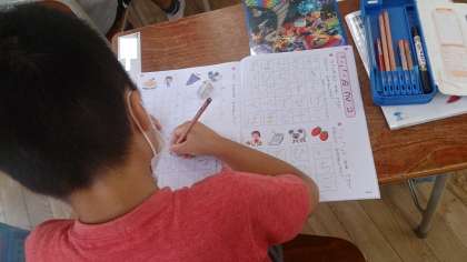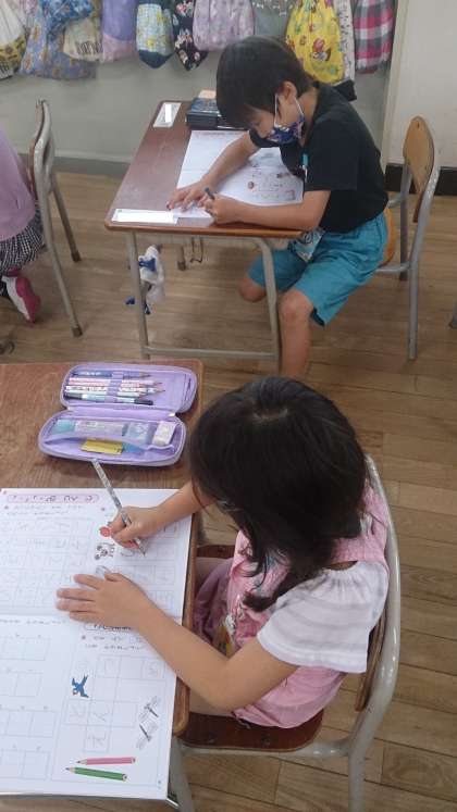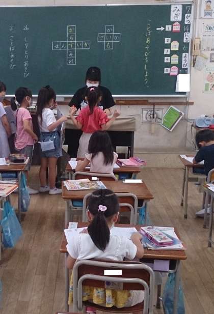 1年生の国語で、「ことばあそび」の学習に取り組んでいます。しりとりやクロスワードなどの言葉遊びの決まりに合った言葉を探して、正しくひらがなで書いています。