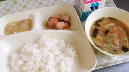 今日の給食は、さけのつけ焼き、みそ汁、とうがんの煮もの、ごはん、牛乳です。