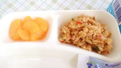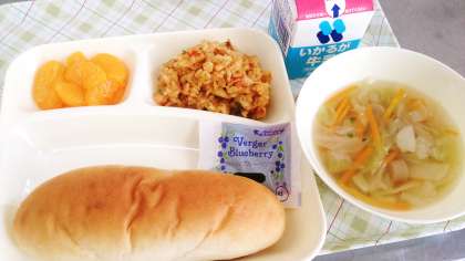 今日の給食は、パエリア、ウインナーとキャベツのスープ、オレンジ、パン、牛乳です。