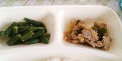 今日の給食は、豚肉のしょうが焼き、みそ汁、さんどまめのごまあえ、ごはん、牛乳です。
