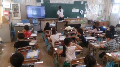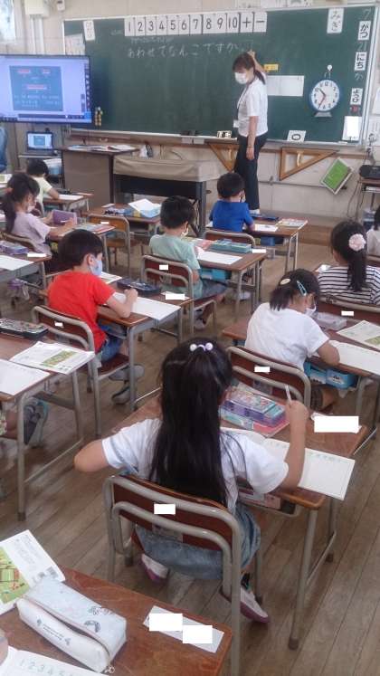 1年生の算数で、文章から立式する学習に取り組んでいます。「あわせてなんこですか。」の文から、立式をして計算していきます。