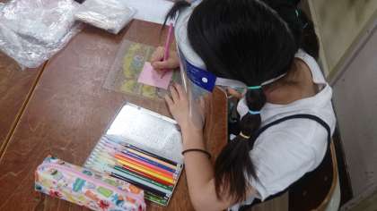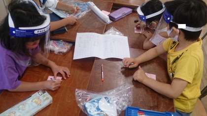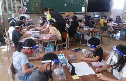 2年生の生活科で校区めぐりの学習に取り組んでいます。校区にある施設や建物を話し合って、郵便局や公園の遊具等を絵に描いています。