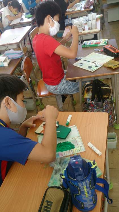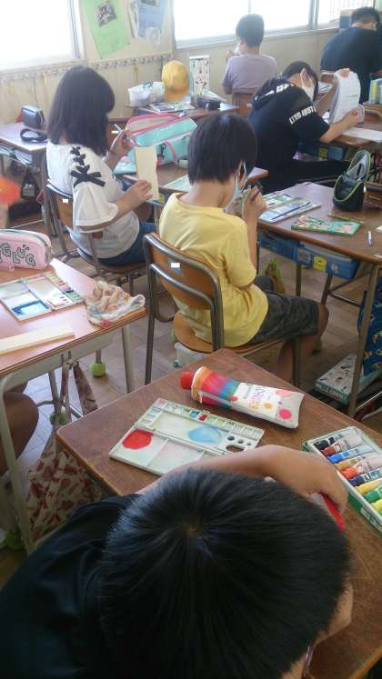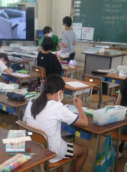 6年生の図画工作で、テープカッターづくりに取り組んでいます。写真は、自分の描いたデザインに合わせて描画して先生に見てもらっている様子です。子どもたちは、とても熱心に描画しています。
