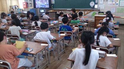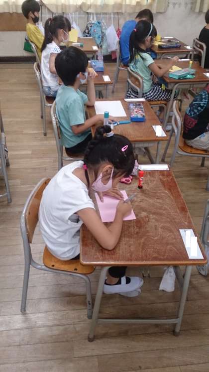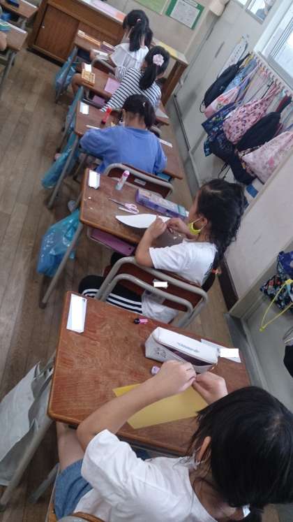 1年生の図画工作で、題材「おって たてたら」の作品づくりに取り組んでいます。紙を折って立てたものから想像したり、切ったり、色を付けたりする活動から、自分が表したいものを表現する学習です。