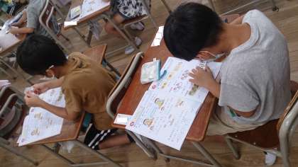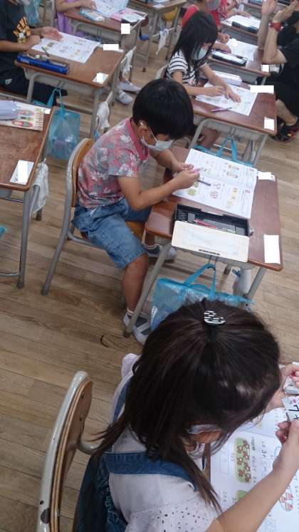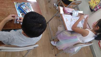 1年生の算数で、学習のまとめとして、たし算カードを使って、計算練習をしています。子どもたちは、とても集中しています。