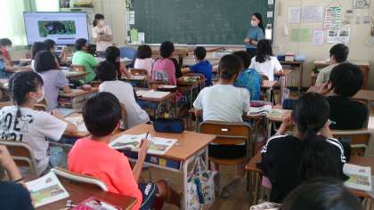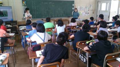6年生の外国語科の学習で、ヒヤリングに取り組んでいます。「but」「bat」「bag」「bug」など、「b」から始まる単語についてゲーム形式で聞き取りしています。
