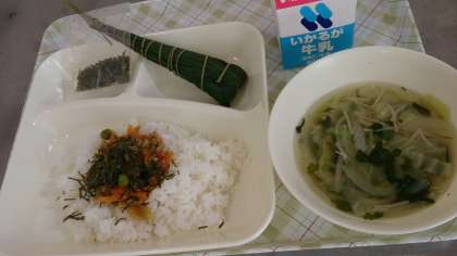 今日の給食は、きんぴらちらし、すまし汁、ちまき、牛乳です。