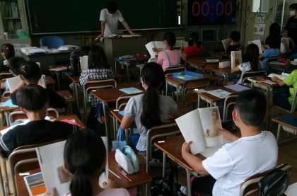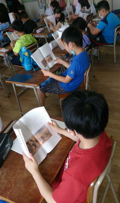 3年生の国語で、物語文「はりねずみと金貨」の学習に取り組んでいます。写真は、一人ずつ丁寧に音読している様子です。