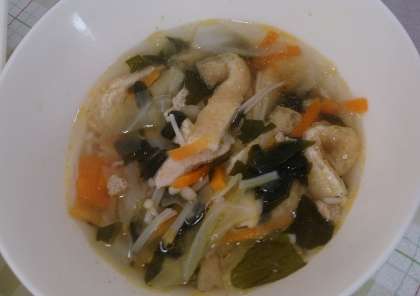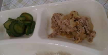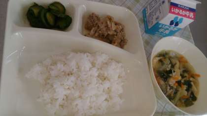 今日の給食は、豚肉のごまだれ焼き、五目汁、きゅうりのおかかあえ、ごはん、牛乳です。