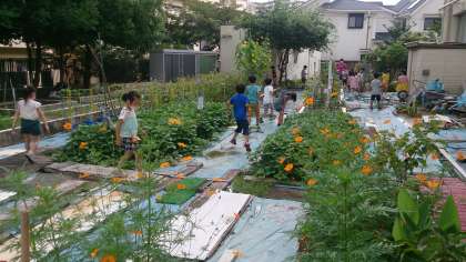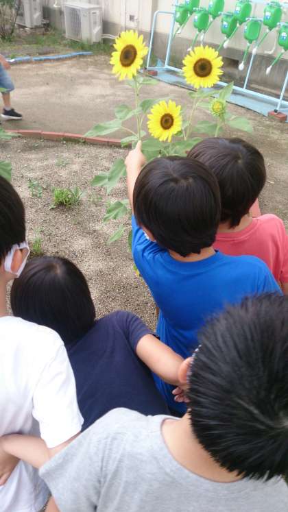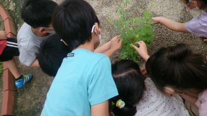 1年生の生活科で、学習園の植物や生き物の観察をしています。子どもたちは、積極的に移動しながら、花についた虫や水の中の生き物などを注意深く見ています。