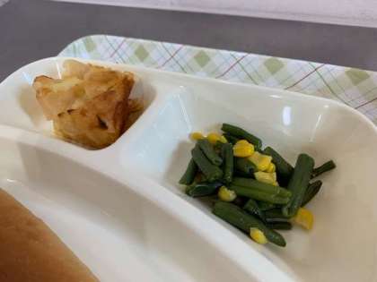 今日の給食は、ケチャップに、さんどまめとコーンのソテー、りんごのクラフィティ、パン、牛乳です。