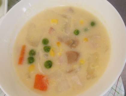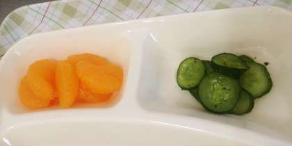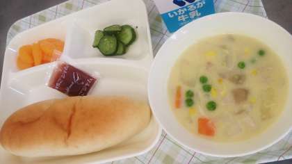 今日の給食は、コーンクリームシチュー、きゅうりのバジル風味サラダ、みかん、パン、牛乳です。