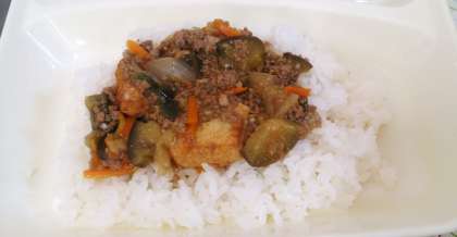 今日の給食は、マーボーあつあげ丼、中華スープ、ミニフィッシュ、牛乳です。