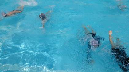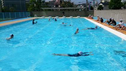 今日は、2組の水泳学習です。写真は、プールの横を往復してクロールの練習をしている様子です。午後からは6年生の水泳学習があります。