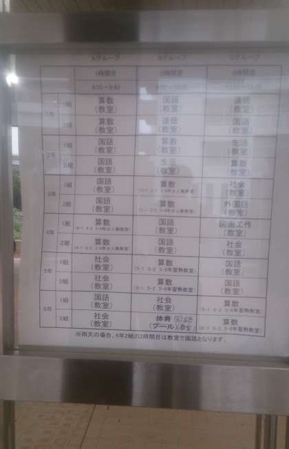 9月4日(金)、本日は、学習参観があります。あいにくの雨ですが、保護者の皆様方にはご参観よろしくお願いいたします。玄関に、参観の教科と教室が掲示してありますので、ご覧下さい。