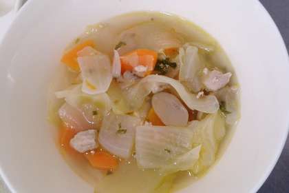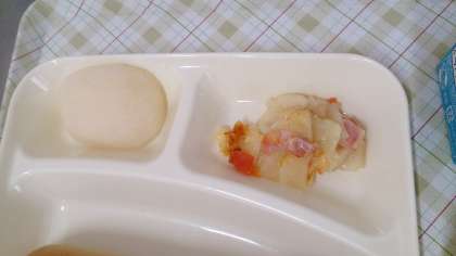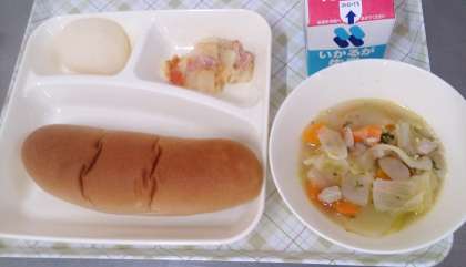 今日の給食は、鶏肉とてぼ豆のスープ煮、じゃがいもとトマトのチーズ焼き、なし(豊水)、パン、牛乳です。