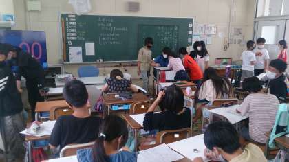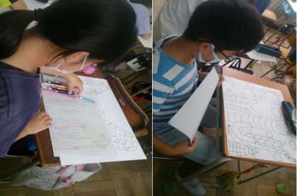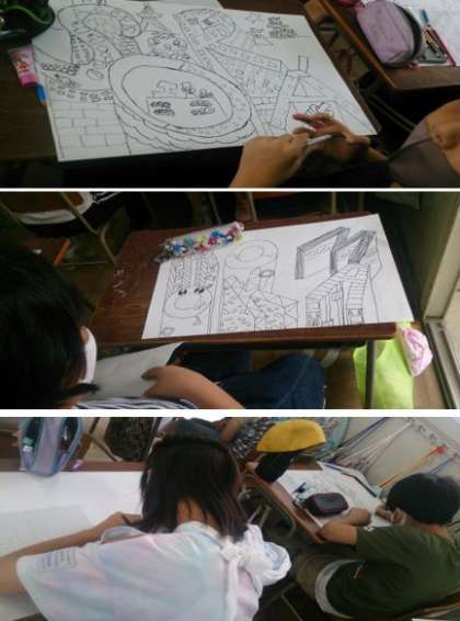 自分の名前をビルに見立て描画しています。ペンでしっかりと描いています。
