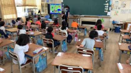 描いた作品をみんなの前で発表する時間でした。どんな絵を描いたのか指し示しながら発表していました。聞いている児童はどんなところが良いか発表し、図画工作でも伝え合う活動に取り組んでいました。