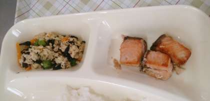 今日の給食は、さけのしょうゆ風味焼き、五目汁、高野どうふのいり煮、ごはん、牛乳です。