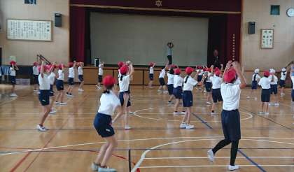 運動会に向けての練習が始まりました。先生の見本を見ながら、はじめはゆっくりで練習しています。