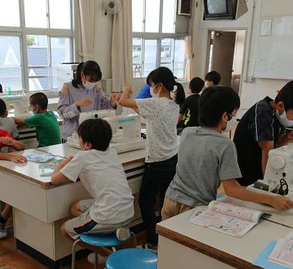 家庭科室でミシンの使い方を学習しています。糸をどこに通せばいいか、友だちと確かめながら学んでいきました。