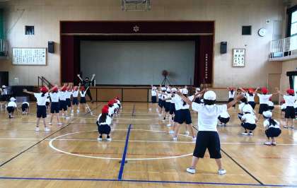 今週から、運動会の練習が始まりました。1.2組いっしょに、講堂で団体演技の練習をしました。みんな元気いっぱい体を動かしました。
