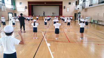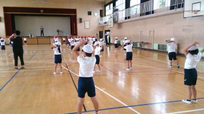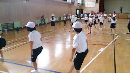 運動会の練習をしました。先生のダンスに合わせて踊っています。振りを熱心に覚えています。