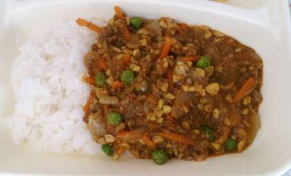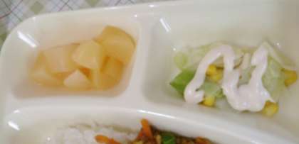 今日の給食は、大豆入りキーマカレーライス、キャベツとコーンサラダ、白桃、牛乳です。