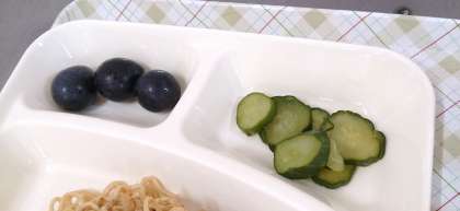 今日の給食は、焼きそば、きゅうりのしょうがづけ、ぶどう(巨峰)、パン、牛乳です。