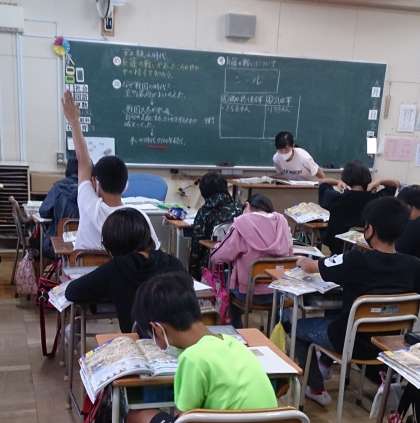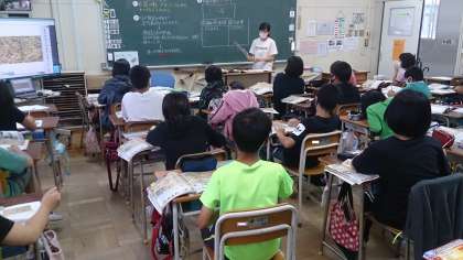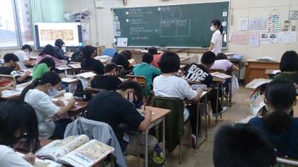 安土桃山時代の学習をしました。「長篠の戦い」の様子を表した長篠合戦図屏風から、この時代の様子を調べています。