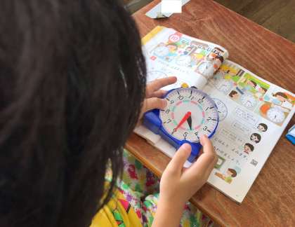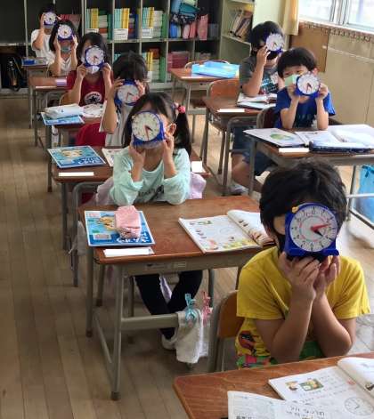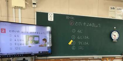 「なんじ なんじはん」の学習をしました。みじかい針をよむと何時かわかります。時計の針を合わせる活動もしました。