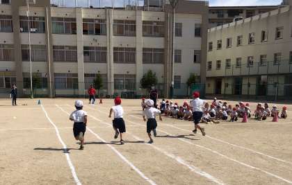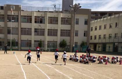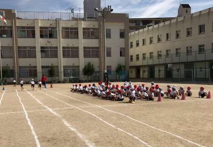 続けて、運動会の個人走の練習をしました。30メートルの直線コースを4人または、3人で走ります。