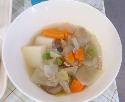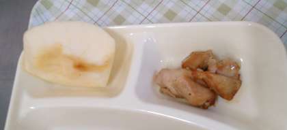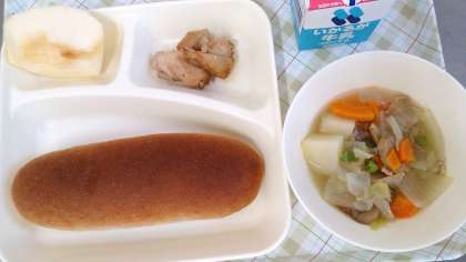 今日の給食は、鶏肉のガーリック焼き、豚肉と野菜のスープ煮、りんご、パン、牛乳です。